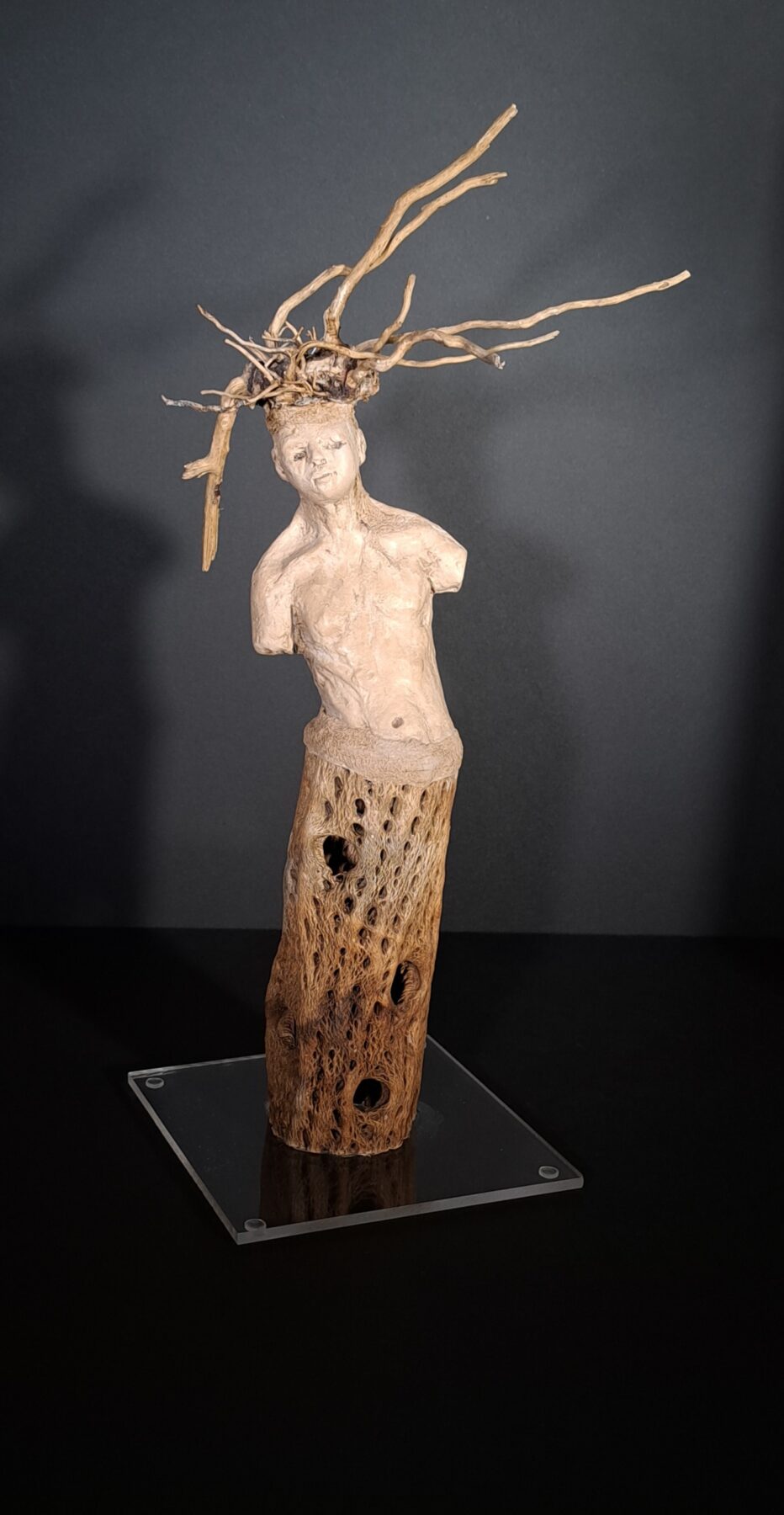 Interprétation du corps ARES – Grès – corne – bois et tissu – Hauteur 95 cm ADEOS – Grès, bois et tissu ARTEMYS – grès , bois et tissu –